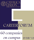 Promovido pelo Gabinete de Desenvolvimento de Carreiras da Católica Lisbon School of Business & Economics, o Forum Carreiras 2013 decorreu no dia 19 de fevereiro e reuniu cerca de sessenta empresas de diferentes setores de atividade naquele que é já o maior evento de recrutamento realizado anualmente naquela faculdade da Universidade Católica Portuguesa. |