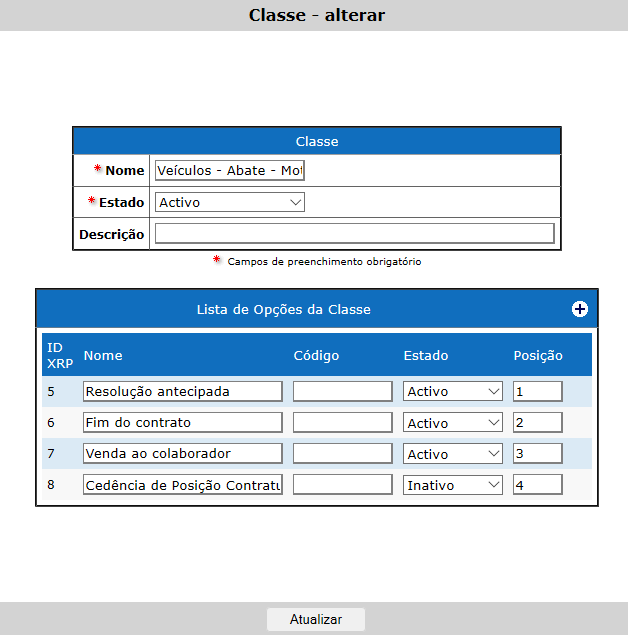 Para inserir as opções utilize o botão . Pode, também, ativar/inativar opções selecionando "Ativo/Inativo" na caixa de Estado. Por fim, clique |Atualizar|.