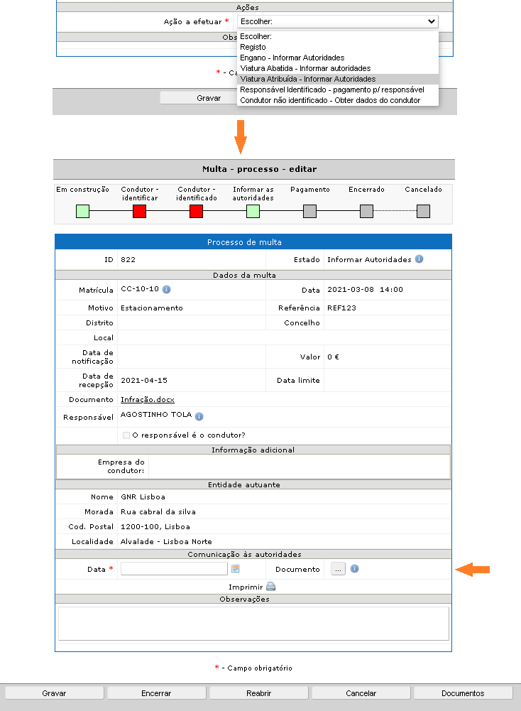 - tem acesso à zona Comunicação às autoridades do ecrã [Multa - processo - editar]. O campo "Data" (de comunicação às autoridades) deve ser preenchido; o campo "Documento", referente ao documento de notificação da multa, deve ser carregado caso queira que fique associado ao processo de multa. O botão |Reabrir| permite colocar o processo novamente no estado Em construção, podendo ser escolhida outra ação a efetuar.