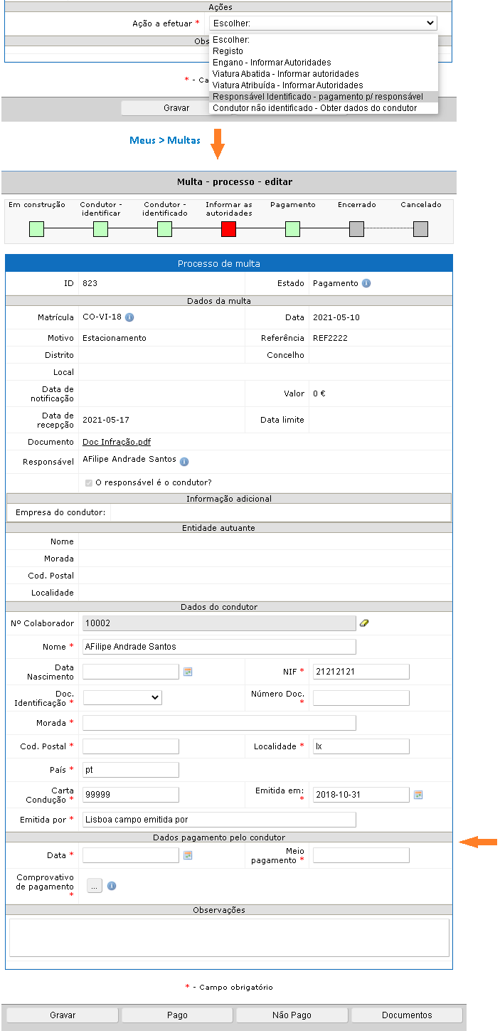 - na zona Dados pagamento pelo condutor do ecrã [Multa - processo -editar], o responsável, ou o gestor de veículos, deve preencher os dados relativos ao pagamento: data, meio de pagamento e comprovativo de pagamento.