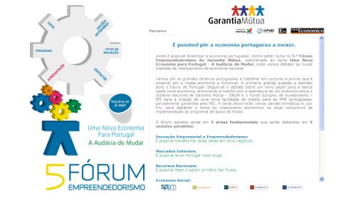O 5.° Fórum Empreendedorismo da Garantia Mútua, subordinado ao tema "Uma Nova Economia para Portugal. A Audácia de Mudar", promovido pela SPGM e pelas SGM (Norgarante, Lisgarante, Garval e Agrogarante), decorreu no passado dia 31 de janeiro no Europarque, em Santa Maria da Feira. Nesta quinta edição, que contou com a presença de nomes como os de Augusto Mateus ou Álvaro Santos Pereira, entre tantos outros, debateram-se novas medidas de relançamento da economia nacional.A exemplo do sucedido em edições anteriores, o site da quinta edição do Fórum Empreendedorismo, onde foram disponibilizadas informações relativas ao evento e através do qual se registaram todas as inscrições, é suportado pela ferramenta de gestão de sites da Escrita Digital, o edPortal e poderá visitá-lo em 5.º Fórum Empreendedorismo.