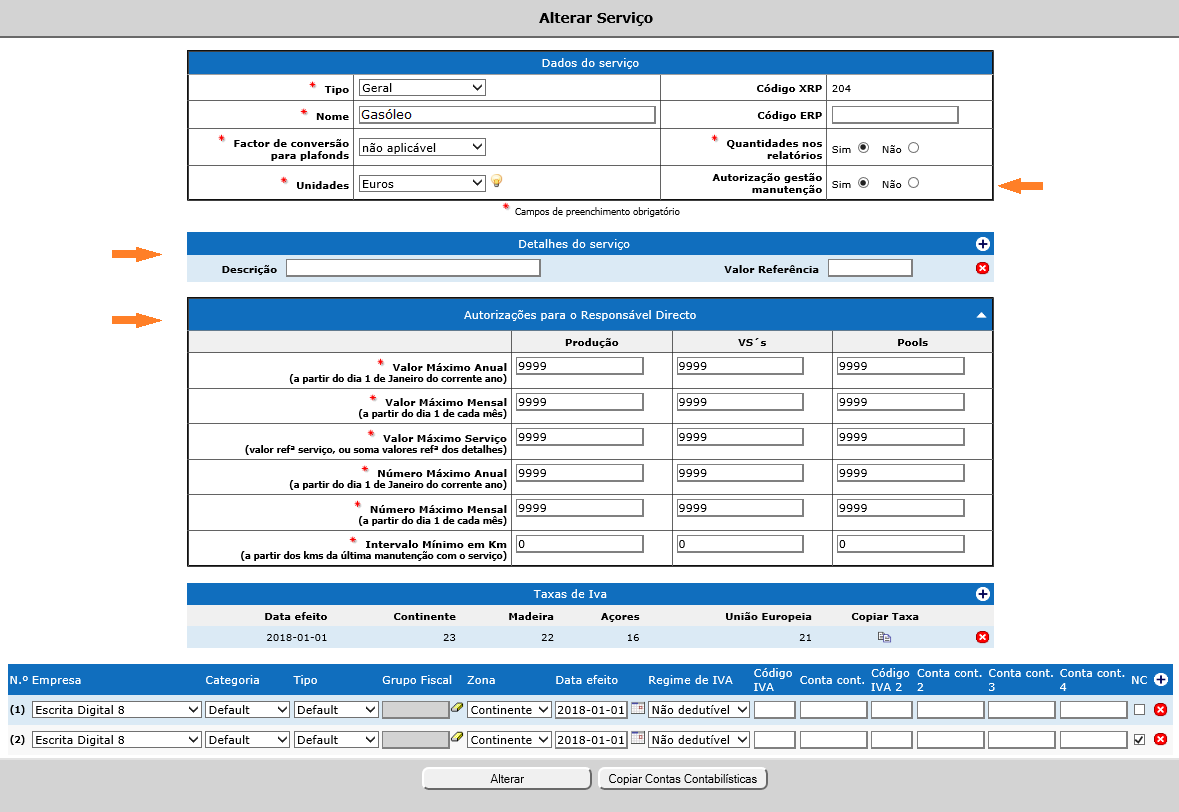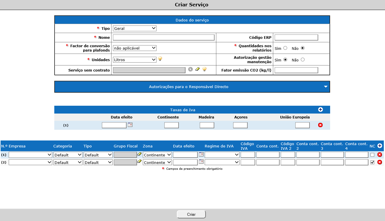 À data atual os valores de referência para o "Fator emissão CO2", consoante o tipo de combustível, são:- Gasóleo (1) - FCO2 = 2,640 kg/l- Gasolina (1) - FCO2 = 2,392 kg/l- GPL (1) - FCO2 = 1,665 kg/l- Elétrico (2) - FCO2 = 0,209 kg/KWhFontes:(1) Website Ecoscore - http://ecoscore.be/en/info/ecoscore/co2.(2) Dado da EDP de 2017 das emissões de CO2, em kg, por kWh de energia elétrica produzida.Taxas de IVAAs taxas de IVA permitem que nas estatísticas dos veículos, ou dos complementos, seja apresentado o valor com IVA ou o custo suportado. Contas contabilísticasCada linha especifica as condições em que se aplicam os códigos contabilísticos e de IVA, e o regime de IVA. As linhas para os movimentos de crédito devem ter a checkbox da coluna NC (Nota de Crédito) selecionada.Caso a aplicação não encontre a linha com a classificação do veículo\complemento associado à despesa, é considerada a linha da empresa com o dado Default na Categoria e no Tipo. Caso não encontre o Grupo Fiscal do veículo, a linha a considerar terá de ter também o Grupo Fiscal vazio.Nota: Para acrescentar linhas às tabelas, clique no ícone "+", à direita do respetivo cabeçalho.Processos de Manutenção\Despesas - configuraçõesApenas podem ser associados serviços do tipo geral a estes processos. Para estes serviços é necessário configurar, além do campo "Configuração gestão manutenção", duas zonas adicionais: "Detalhes do serviço" e "Autorizações para o Responsável Directo".