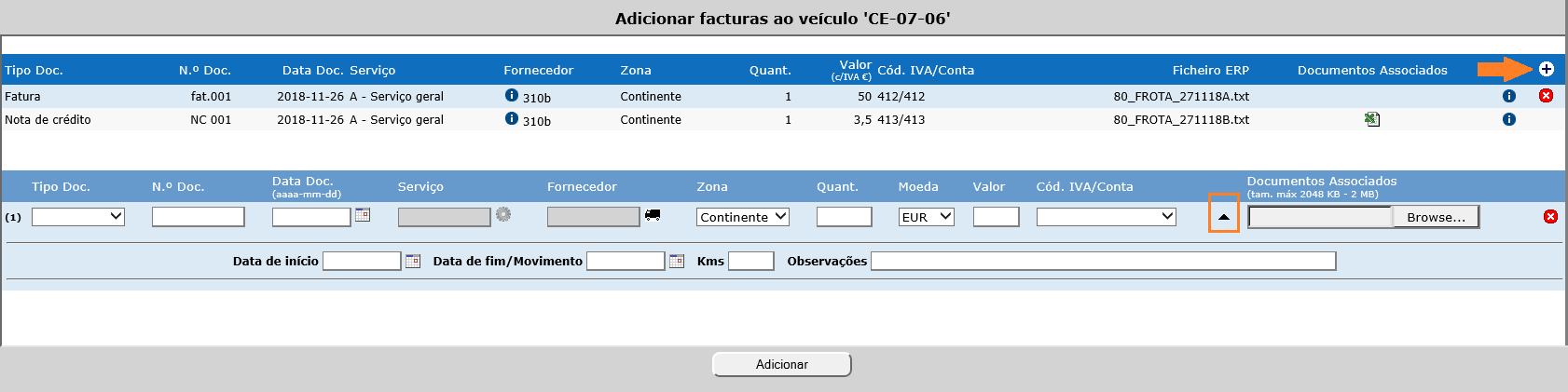 5) Ao clicar neste ícone cria uma nova linha onde deve preencher os campos com os dados da fatura, podendo também inserir um documento, nomeadamente, o da fatura.Para o campo "Tipo Doc." deverá indicar se o movimento que está a registar é uma fatura (movimento de débito, ou seja uma despesa) ou uma nota de crédito (movimento de crédito, ou seja uma devolução de valor). Para o campo "Valor", deverá indicar sempre um valor positivo. Para preencher aos dados, que se encontram na segunda linha, Datas, Kms e Observações, clique no ícone ▼ para expandir a linha debaixo. O ícone ▲ esconde esta linha.6) Após preencher os dados necessário clique no botão |Adicionar|.Após inserir os dados da fatura/nota de crédito, o movimento é processado para integração para ERP. Quando o processamento fica concluído é apresentado o nome do ficheiro ERP na respetiva coluna. Este ficheiro fica disponível para os utilizadores com o perfil Contabilidade, pelo menu: Gestão > Contabilidade > Exportações > Faturas - Imp. p/ficheiro.