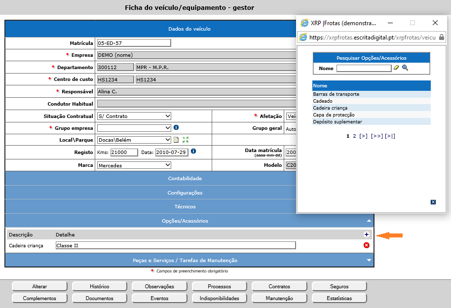 Para adicionar uma opção/acessório à ficha do veículo, na zona Opções/Acessórios clique no ícone