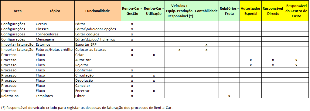 Na tabela apresentada no presente artigo, são indicados os perfis e as funcionalidades associadas a esses perfis, referentes aos processos de Rent-a-Car.